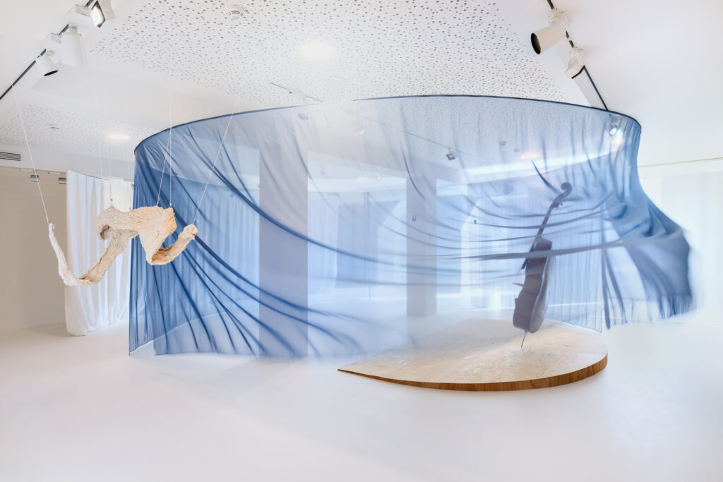 Zwischen Installation und Performance steht der Kontrabass als eigenständiger Körper in der Ecke und im Raum. Über Nylonschnüre hängt er in der Schwebe, hält sich selbst und wird gespielt. Rhythmische Bewegungen fahren durch den Bass, bleiben statisch und monoton bis sie in Polyrhythmen enden. Vibrierende Ringe an den Nylonsaiten übertragen Liebesworte auf das Instrument und resonieren im Bauch des Kontrabass.