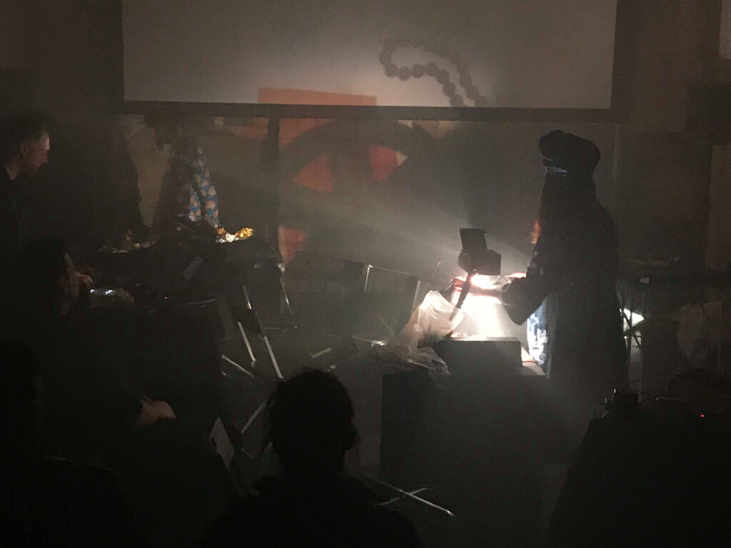 ‚In the journey of light‘ is a surreal audio-visual performance combining experimental sound, analog projection, poetry and electro acoustic. The performance is an imaginary journey, a surrealist shadow play where the four performers combine voice and electronic soundscape. The room becomes an immersive flickering light space, an electric movie set immersing the viewer in cinematic tale.