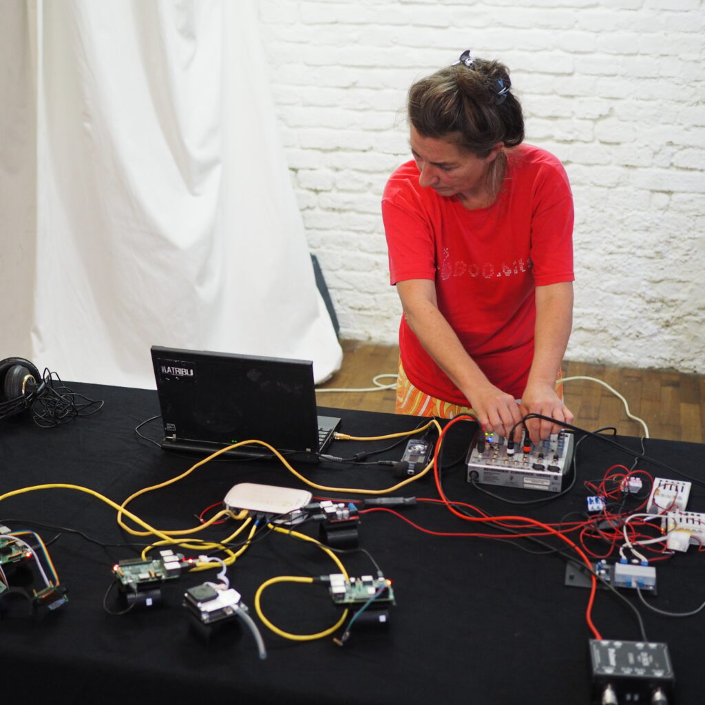In ihren Arbeiten geht Reni Hofmüller auf das Vorhandene ein: Menschen, die Umwelt und natürlich Klänge. Sounds, kleine und große Schnipsel aus der Vielzahl an Hörbarem und Unhörbarem. Sie nimmt, was da ist. Gebäude, Skulpturen, Werkzeuge, Materialien und Klänge – sie schaut sie sich genau an und haucht ihnen neues Leben ein. Sie entwickelt neue Formen aus dem Istzustand – sowohl in ihrer künstlerischen als auch in ihrer gesellschaftspolitischen Arbeit. Ihre Arbeiten sind eine Galaxie der Vorstellung einer resonanten Welt. Nicole Pruckermayr