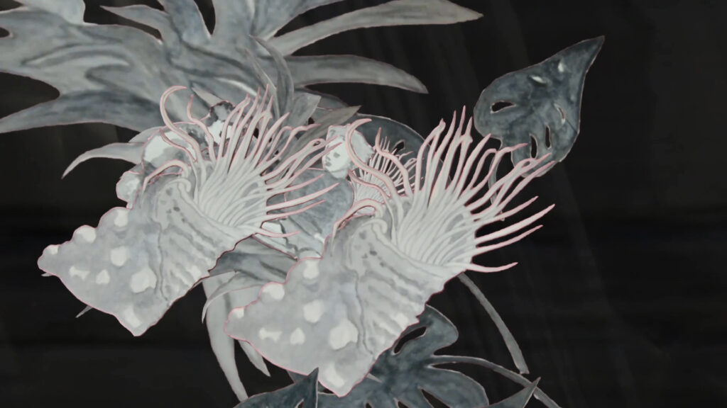 Maria Peters wird in ihrer Sprachperformance sowohl stimmlich wie körperlich mit einer Film- und Soundebene interagieren, ihre objekthaften Requisiten werden im Lauf der Performance zu einem Schlussbild arrangiert – welches letztlich mit einer algorithmischen Arbeit von Vera Sebers amalgamieren wird.